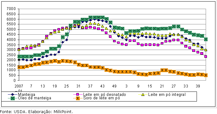 Gráfico 1. Evolução dos preços de exportação de lácteos do Oeste da Europa, em dólares por tonelada.