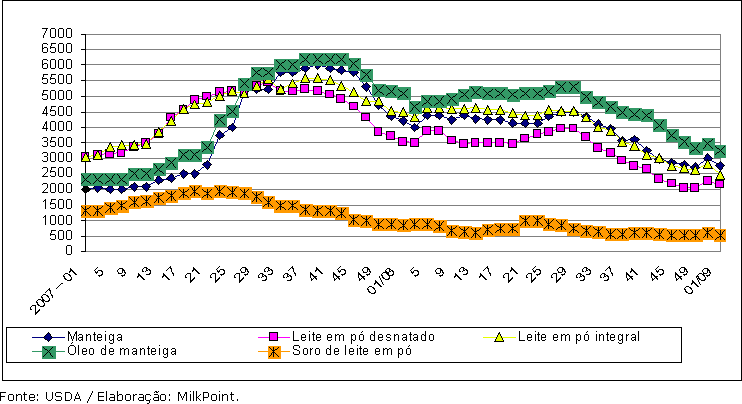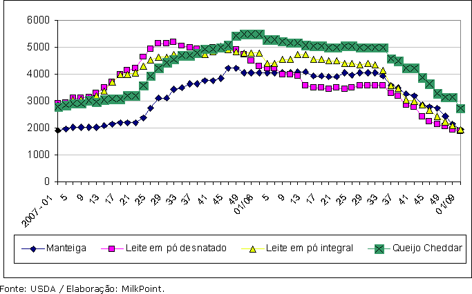 Gráfico 1. Evolução dos preços de exportação de lácteos do Oeste da Europa, em dólares por tonelada.
