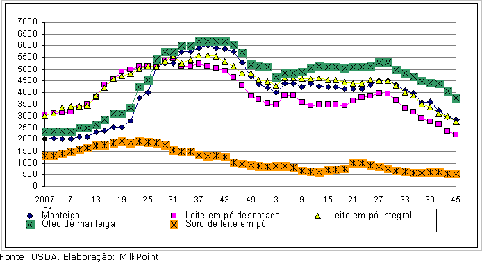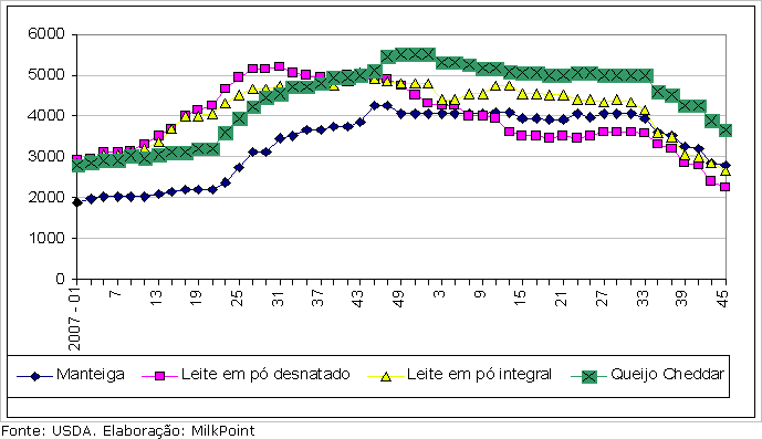 Gráfico 1. Evolução dos preços de exportação de lácteos do Oeste da Europa, em dólares por tonelada.