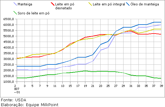 Gráfico 1. Evolução dos preços de lácteos exportados do Oeste da Europa, em dólares por tonelada.