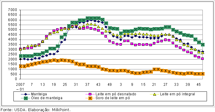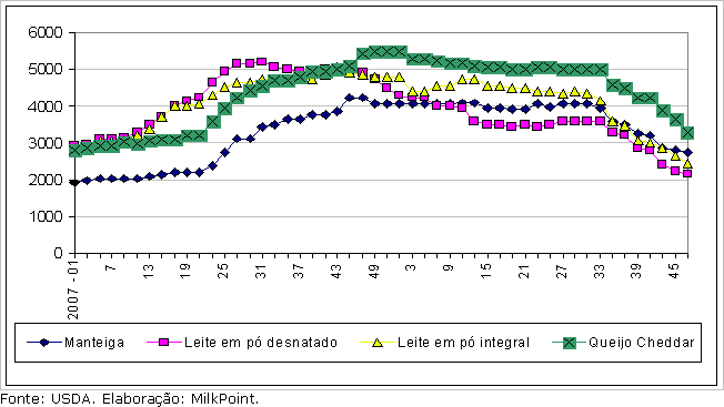 Gráfico 1. Evolução dos preços de exportação de lácteos do Oeste da Europa, em dólares por tonelada.