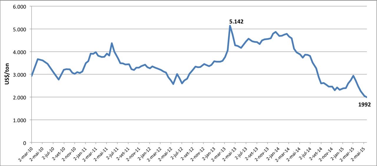 Os valores do leite em pó integral também estão em patamares bem inferiores aos dos últimos anos, mas já chegaram a ser menores do que atualmente. O produto, cuja cotação atingiu US$ 5.245 por tonelada em abril de 2013 ¬ graças, sobretudo, à forte demanda chinesa ¬, foi negociado a US$ 2.390 no último leilão.