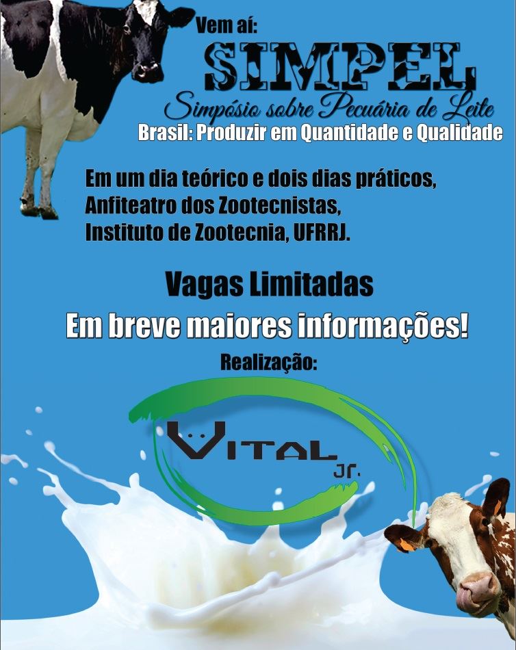 A Vital Jr. realiza entre os dias 11 e 13 de junho o I Simpósio sobre Pecuária de Leite. O objetivo é abordar temas pertinentes à atividade, bem como nutrição do rebanho leiteiro, formação de pastagens, boas práticas, qualidade do leite e logística, avaliando a importância destes fatores para o sucesso do negócio. O Simpósio será realizado no Anfiteatro dos Zootecnistas, Instituto de Zootecnia da Universidade Federal Rural do Rio de Janeiro, na rodovia BR-465, km 7 Seropédica-RJ. O evento contará com dois dias práticos (12 e 13 de junho), sendo o número de vagas limitado a 35 pessoas.