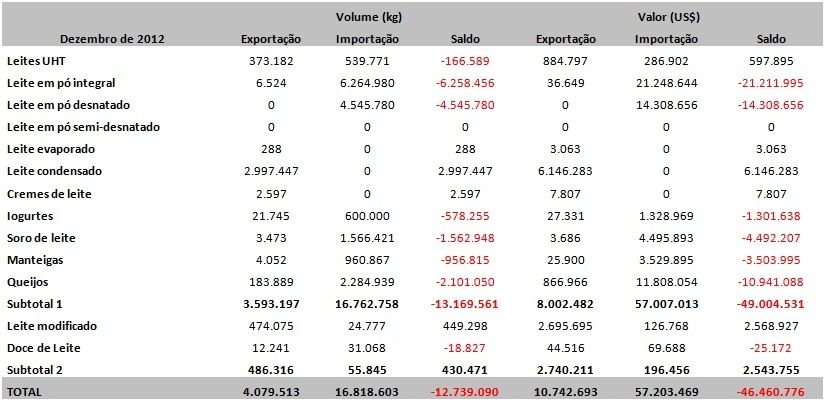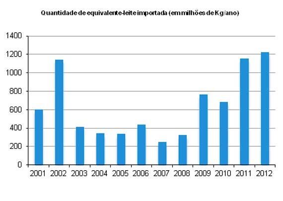 Em 2012, foram internalizados 1.224 milhões de litros de leite, valor 6% maior que o total importado em 2011. Já o volume exportado foi de 114 milhões de litros, 6% a menos do que em 2011. Essa combinação de aumento das importações e diminuição das exportações causou um crescimento de 7,5% no déficit da balança comercial de lácteos, em equivalente-leite, na comparação 2012 x 2011.