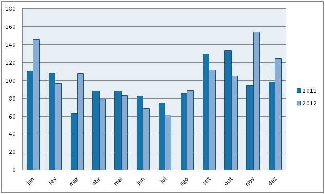 Gráfico 1 – Quantidade de equivalente-leite importada mensal – 2012 x 2011