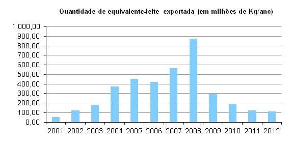 Já as exportações tiveram queda de 6,3%, na comparação em equivalente-leite com 2011, alcançando 114 milhões de litros. Nos últimos 12 anos, a quantidade exportada foi maior apenas que a do ano de 2001, como pode ser visto no gráfico abaixo: