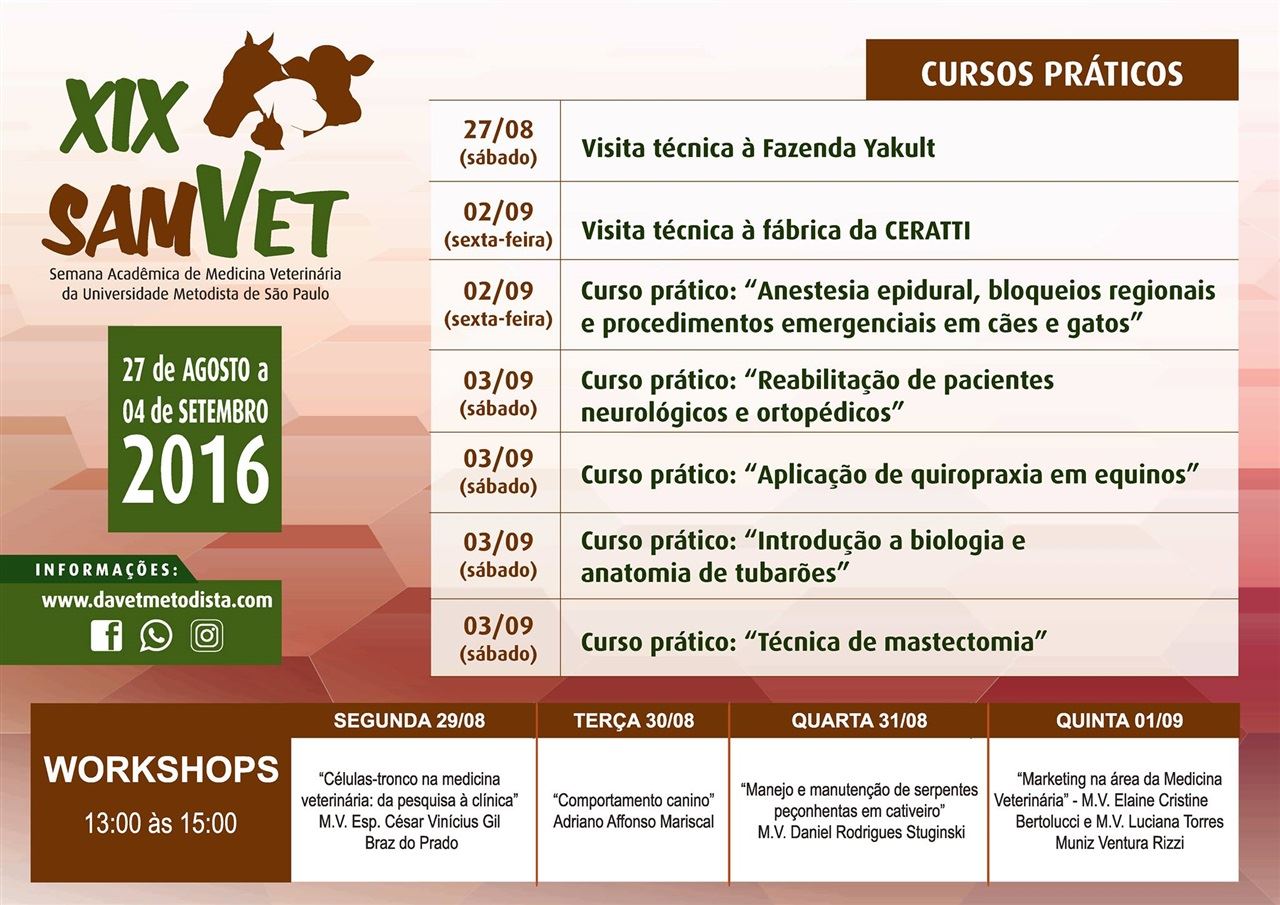 A realidade atual determina um mercado competitivo onde cabe a cada um estar sempre se aprimorando e aperfeiçoando seus conhecimentos, visando o fortalecimento profissional. Aproveite a SAMVET para criar vínculos profissionais e adquirir novas experiências que contribuam para a sua carreira como Médico Veterinário.