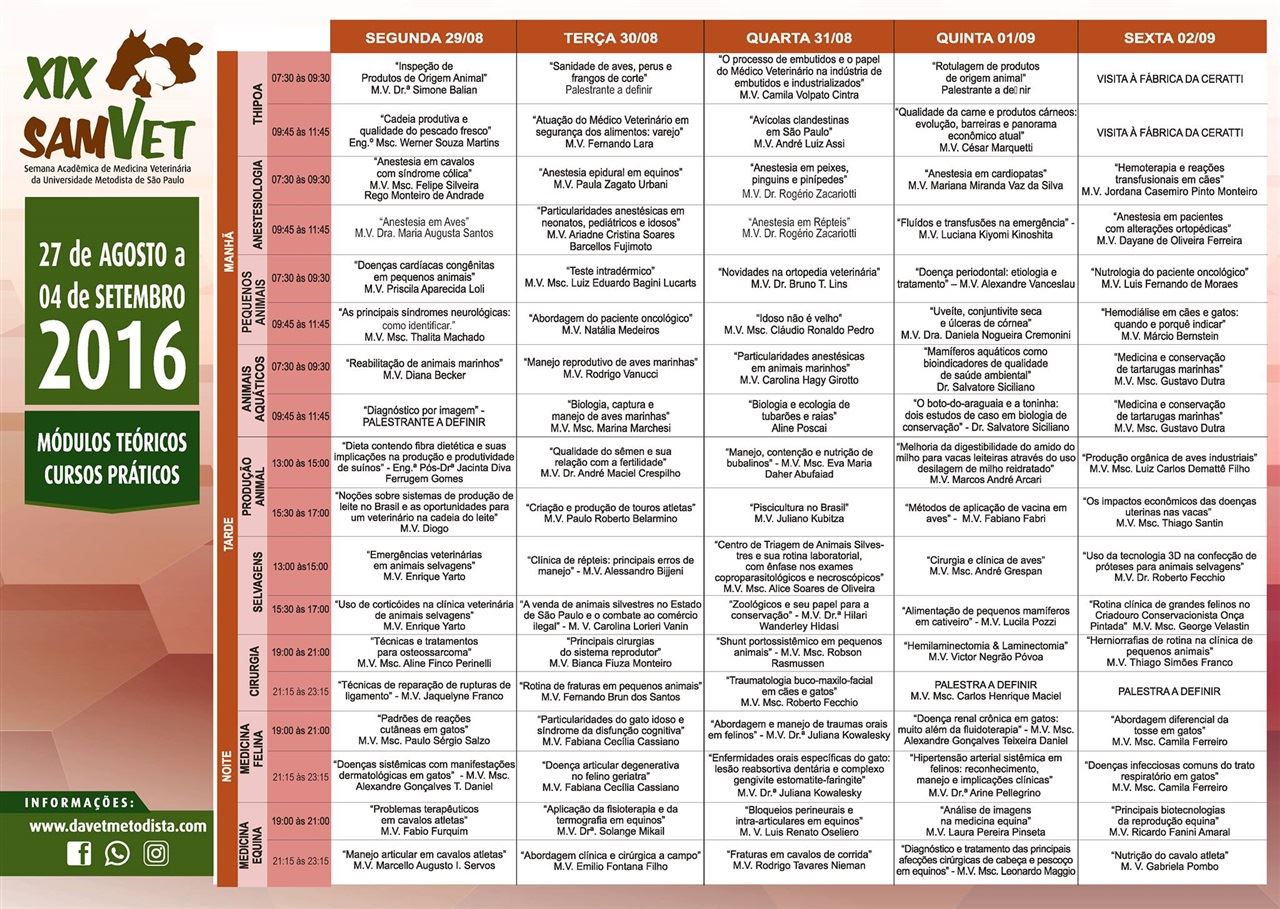 O evento é focado em estudantes e médicos veterinários e este ano conta com 9 módulos durante todo o dia (clínica de pequenos, clinica médica de felinos, anestesiologia, produção animal, THIPOA, animais aquáticos, equinos e cirurgia).
